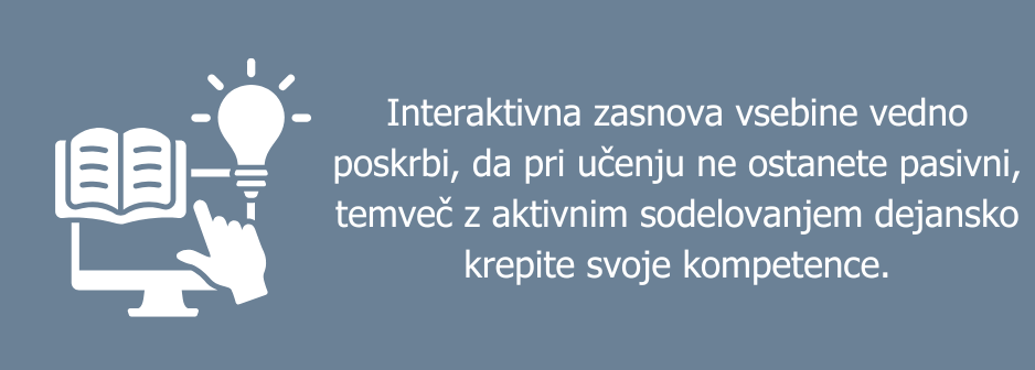 Naša e-izobraževanja so usmerjena k interaktivnemu učenju. To pomeni, da pri učenju niste le v vlogi pasivnega bralca ali gledalca, temveč aktivno sodelujete. Raziskave namreč kažejo, da aktiven učni proces prinaša boljše rezultate pri pomnjenju in prenašanju znanja v delovno prakso.